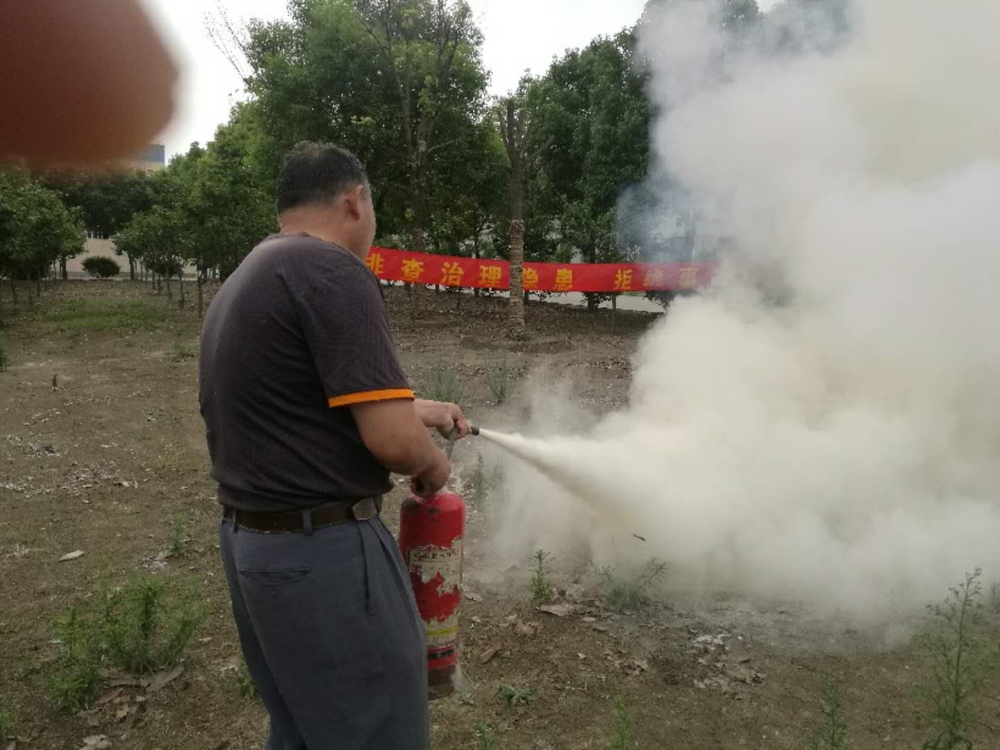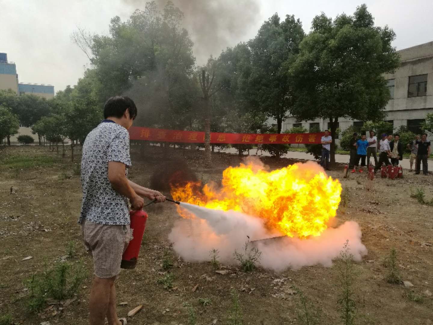 在消防安全知識(shí)培訓(xùn)結(jié)束后,消防員錢國(guó)圣、潘長(zhǎng)昭組織大家進(jìn)行油盆滅火消防演練。