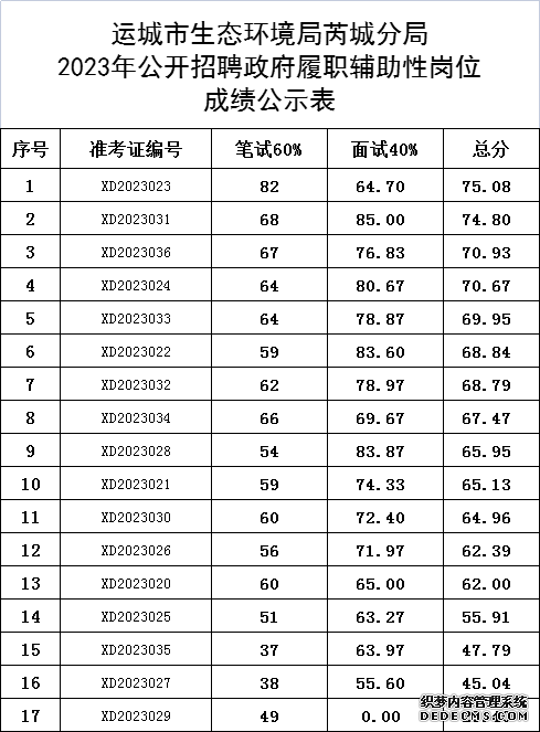 運(yùn)城市生態(tài)環(huán)境局芮城分局2023年公開招聘政府履職輔助性崗位工作人員成績(jī)公示如下: